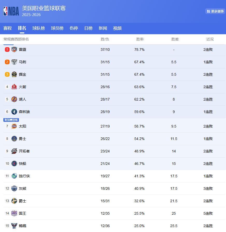 西部最新排名: